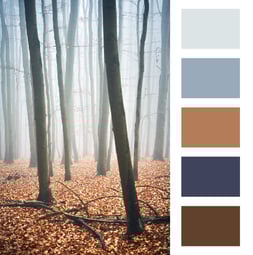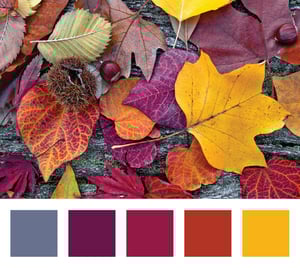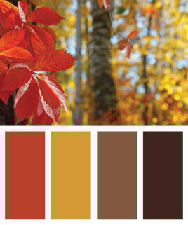 If you have slate greys (with blue undertones) and/or red-stained browns, this palette (to the right) is perfect for you! What’s even better is the flexibility of these hues. You can swap the colors for similar hues. The burnt yellow can be swapped for gold, the royal purple for a deep shimmer color, even the red-stained brown can be swapped. It’s also not necessary to have all five colors in your room. A simple combination of three or four will bring Autumn into your home.