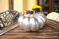 Oh…my…goodness… LOOK AT THIS BEAUTY. A gorgeous silver with a mirror-esque effect. If your primary colors are neutral (think white, cream, tan, beige, light brown), this color will suit your room well. Complimentary colors are deep red, amber, yellow, deep orange, anything neutral, royal purple…okay, perhaps it’s easier to cover colors that won’t work well with these mirrored pumpkins in an autumn theme: best to stay away from blue, darker greens, pink, and anything neon.