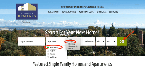Step #1: Narrow down the search criteria by clicking on "Rental Search" in the main navigation and selecting "Apartment" and "Chico," then hit "GO!"
