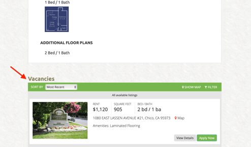 Once you've had time to look through the different complexes, and before you begin the application process, make sure there are vacancies within that complex. You can find out if there are any vacancies by scrolling towards the bottom of the page, past Floor Plans, until you see the header Vacancies.
